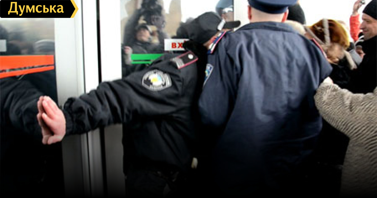 Между участниками митинга и охраной обладминистрации произошла потасовка, в результате которой была выломана пластиковая дверь на входе в вестибюль и выбиты стекла.