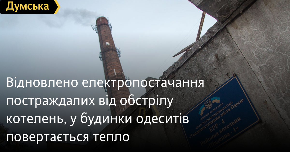 Електропостачання двох котелень, які постраждали внаслідок атаки окупантів по Одесі 18 лютого, відновлено.