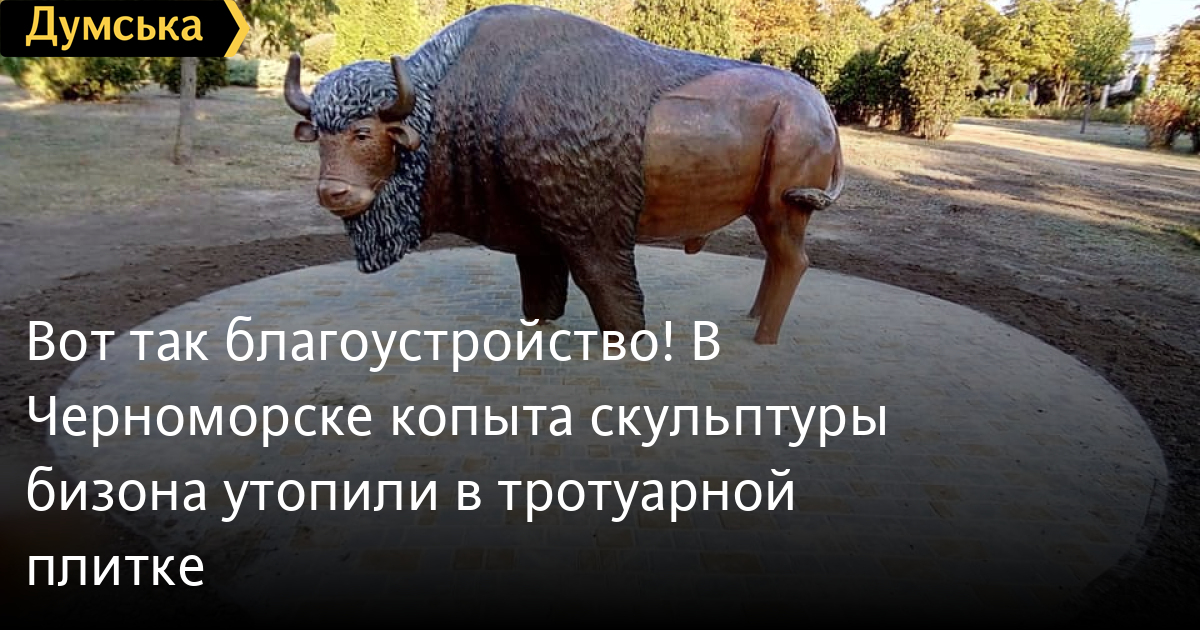 Вот так благоустройство! В Черноморске копыта скульптуры бизона «утопили» в тротуарной плиткеРабота бракоделов из Черноморска веселит народ в соцсетях и расстраивает местных жителей. На днях в Приморском парке строители залили копыта скульптуры бизона в тротуарную плитку. Ранее вокруг фигуры был вытоптанный газон. Вероятно, что благоустроители хотели, как лучше, и застелили газон плиткой, чтобы туристам и местным жителям было удобней фотографироваться рядом с черноморской достопримечательностью. Фото из группы «Черноморск, как он есть» СМЕРТЬ РОССИЙСКИМ ОККУПАНТАМ! Заметили ошибку? Выделяйте слова с ошибкой и нажимайте control-enter |
