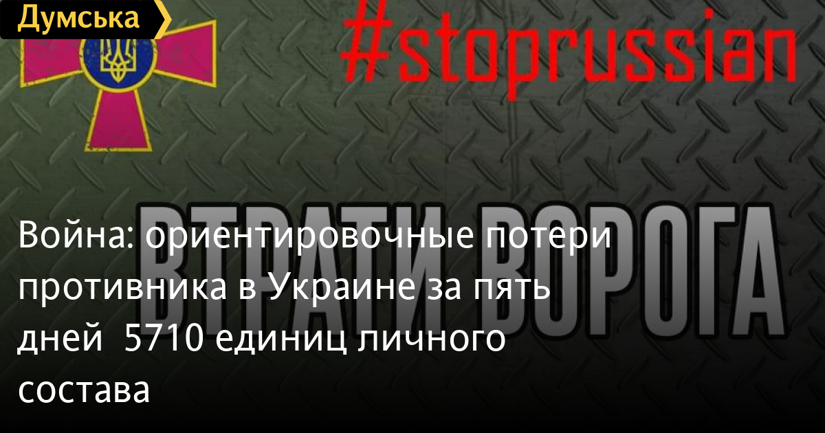 Война: ориентировочные потери противника в Украине за пять дней — 5710 единиц личного составаПо состоянию на 06:00 суммарные ориентировочные потери противника с 24 февраля составили 5710 человек личного состава. Пленных — 200. Об этом сообщили в Генштабе Вооруженных сил Украины. Уничтожены и повреждены 29 самолетов, 29 вертолетов, 198 танков, 846 ББМ. Также украинские воины истребили 77 вражеских артиллерийских систем, семь средств ПВО, 24 РСЗО, 60 цистерн с ГСМ, три БПЛА опертивно-тактического уровня, 305 единиц автомобильной техники, два катера. Подсчет усложняется высокой интенсивностью боевых действий. Данные уточняются. СМЕРТЬ РОССИЙСКИМ ОККУПАНТАМ! Заметили ошибку? Выделяйте слова с ошибкой и нажимайте control-enter |