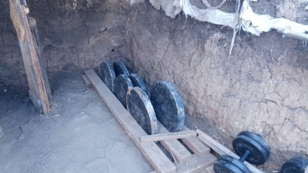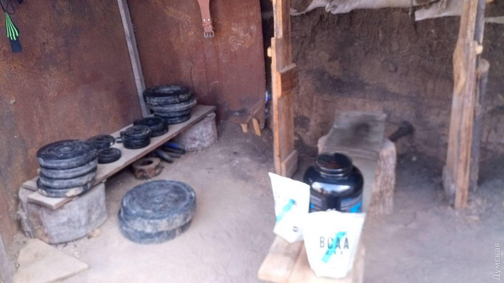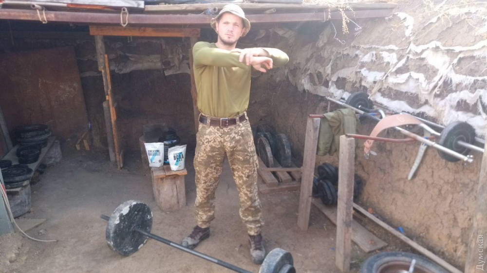 Пока затишье, остается у морпехов время и на спорт. В пятистах метрах от окопов противника украинцы обустроили полноценный полевой спортзал. В «качалке» есть все необходимое – от «блинов» разного веса для штанги до брусьев и перекладины. Даже спортивное питание присутствует – его морские пехотинцы покупают вскладчину за свой счет, благо боевые надбавки позволяют.