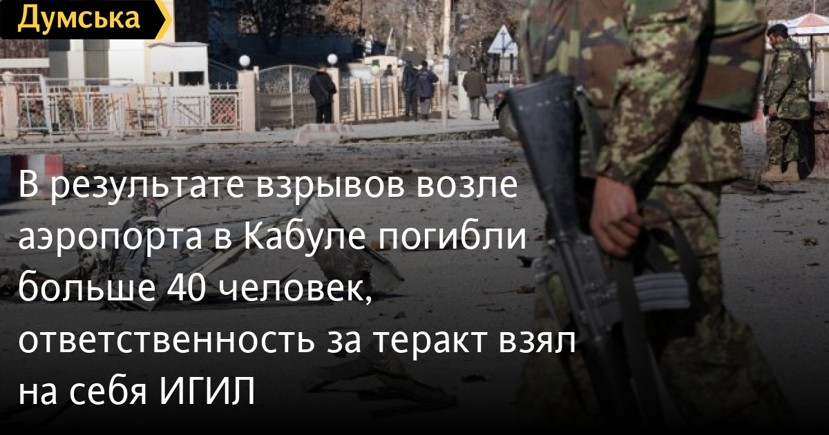 В результате взрывов возле аэропорта в Кабуле погибли больше 40 человек, ответственность за теракт взял на себя ИГИЛВ Минздраве Афганистана сообщили, что в результате взрывов, которые произошли сегодня вблизи аэропорта Кабула, погибли более 40 человек и свыше 100 пострадали. Как сообщает Sky News Arabia, первый взрыв произошел в толпе афганцев, которые пытались попасть на территорию аэропорта. Нападение совершил террорист-смертник. По данным Sky News, второй взрыв осуществили при помощи заминированного автомобиля. В районе взрыва в аэропорту одновременно находились не менее 400 человек. Жертвами теракта стали как минимум 12 американских военных. В МИД сообщили, что украинцев среди погибших и пострадавших нет. «Министр иностранных дел Дмитрий Кулеба поручил посольству Украины в Таджикистане держать на особом контроле ситуацию в связи со взрывом возле аэропорта Кабула. Информация о наличии пострадавших украинцев пока не поступала», — заявил спикер МИД Олега Николенко.