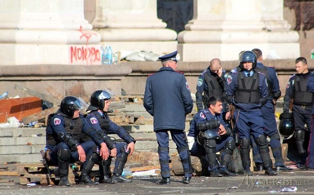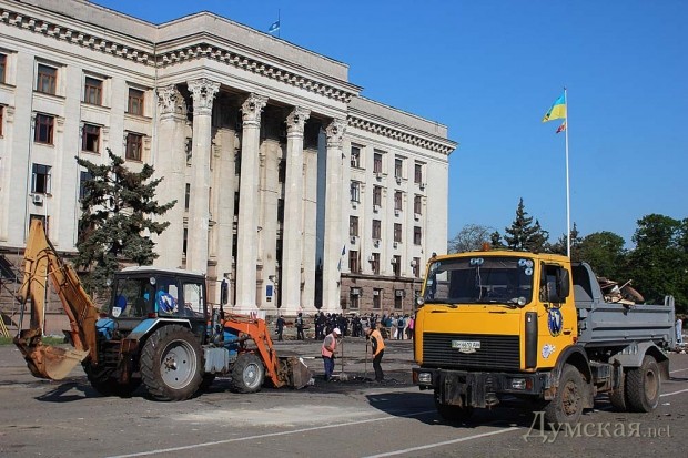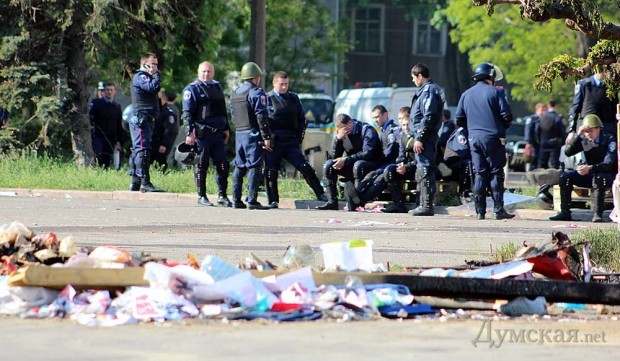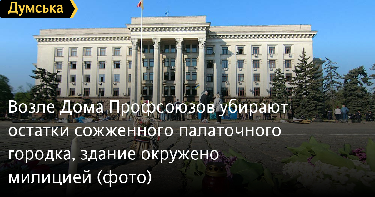 На площади Куликово поле возле здания Дома Профсоюзов с помощью спецтехники продолжается уборка того, что осталось от палаточного городка пророссийско настроенных граждан. Сам Дом Профсоюзов окружен по периметру кольцом милиционеров. Перед зданием собралось около 100 человек, в основном зевак, ни одного родственника кого-либо из погибших наш корреспондент не идентифицировал.