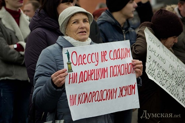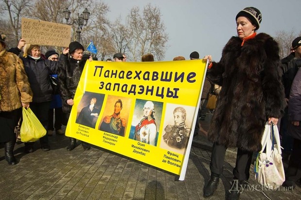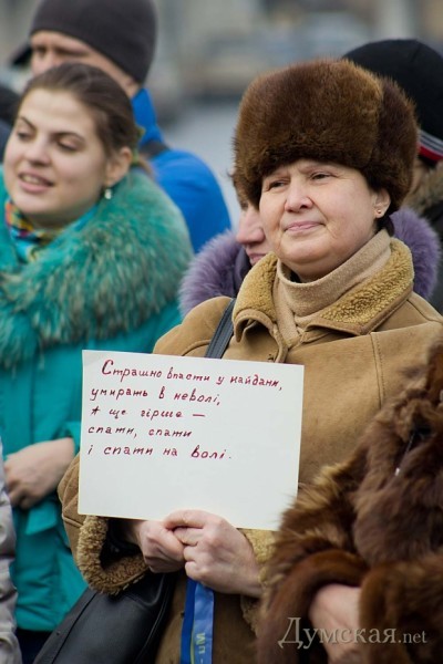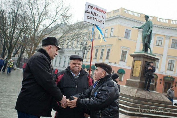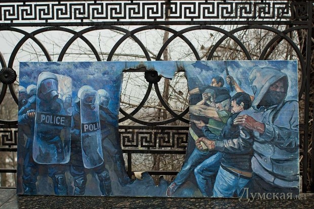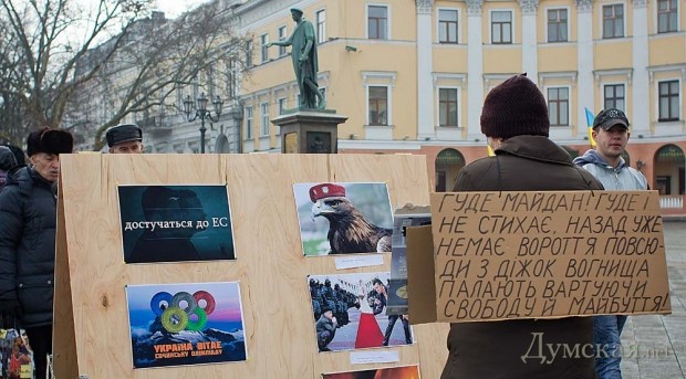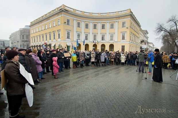 Одновременно с выставкой возле Дюка прошло традиционное «Народное вече». Кроме представителей одесского «Евромайдана», на собрании были замечены 15 молодых людей в балаклавах – активисты одесского крыла «Правого сектора». На случай эксцессов здание мэрии отгородили турникетами, а подъезд со стороны Приморского бульвара — прицепом со спущенными колесами. Впрочем, и на этот раз все прошло мирно.