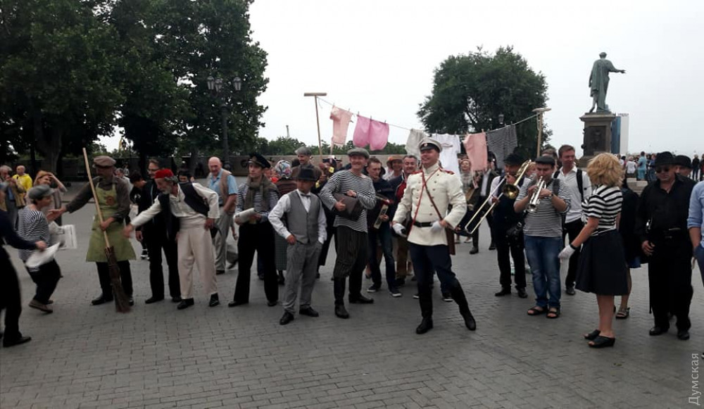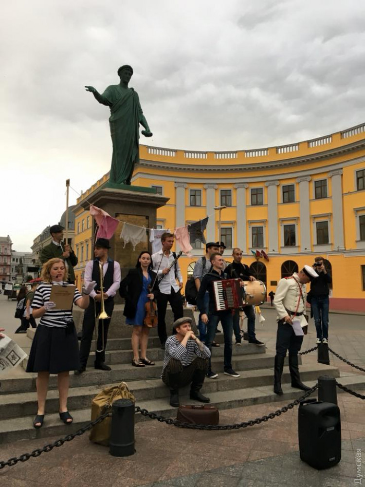 Яркое представление устроили вчера артисты экскурсионного агентства «Тудой-Сюдой» возле Дюка. Костюмированное музыкальное мероприятие называется «Одесский КаленДурь» и будет проходить на постоянной основе каждую последнюю субботу месяца ровно в 7:40.