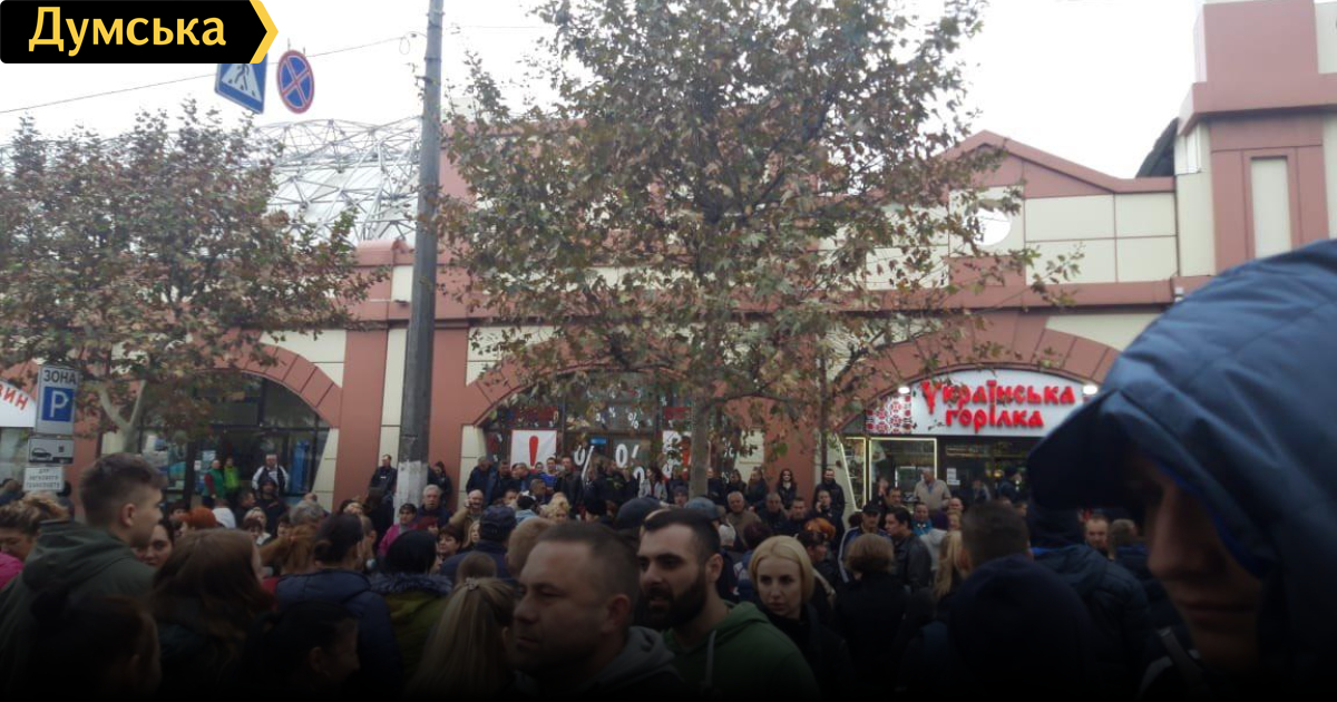 ОБНОВЛЕНО в 12:50. Стала известна цель акции. Оказывается, на протесты вышли работники «Нового Привоза», ЦУМа и бизнес-центра «Шевченковский», требующие защитить их от патриотов. Можно предположить, что организатором мероприятия является окружение нардепа Климова.