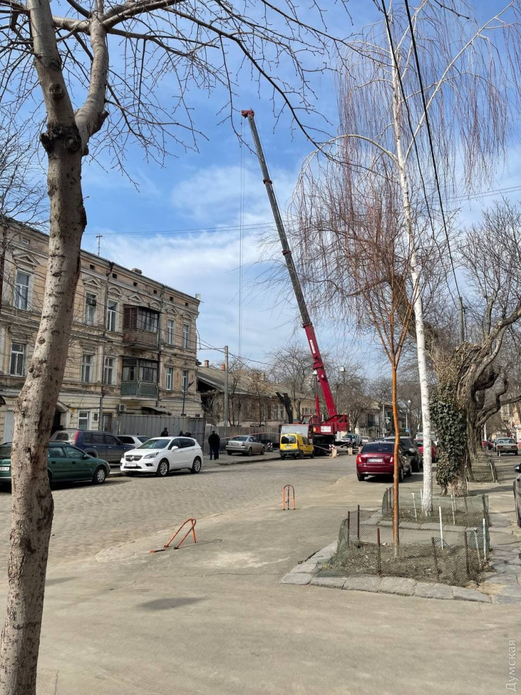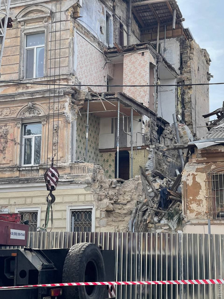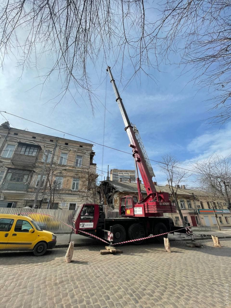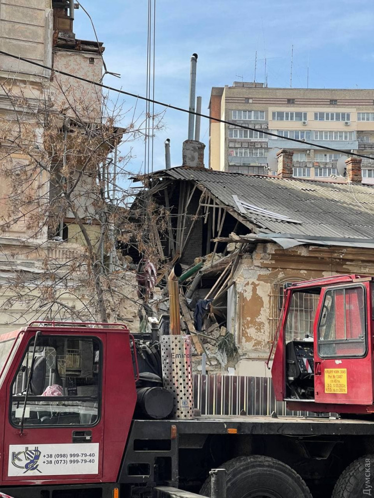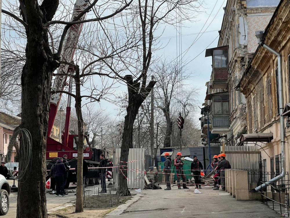 На улице Нежинской, где недавно произошло частичное обрушение дома №16, работает кран. По всей видимости, разбирают завалы.