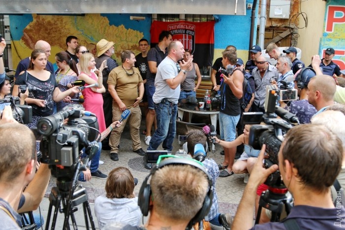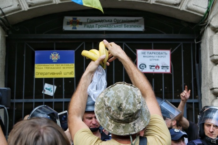 Отметим, что во время акции активисты РГБ от ворот своего штаба не отходили, ограничившись оскорбительными кричалками из-за спин полицейских. Гости тоже не остались в долгу — Гуцалюк бросил через кордон бананы, назвав активистов животными в клетке, фрукты тут же полетели обратно. Кроме того, со стороны РГБ кто-то кинул бутылку, которая попала в журналиста «Думской ТВ« Алию Замчинскую.