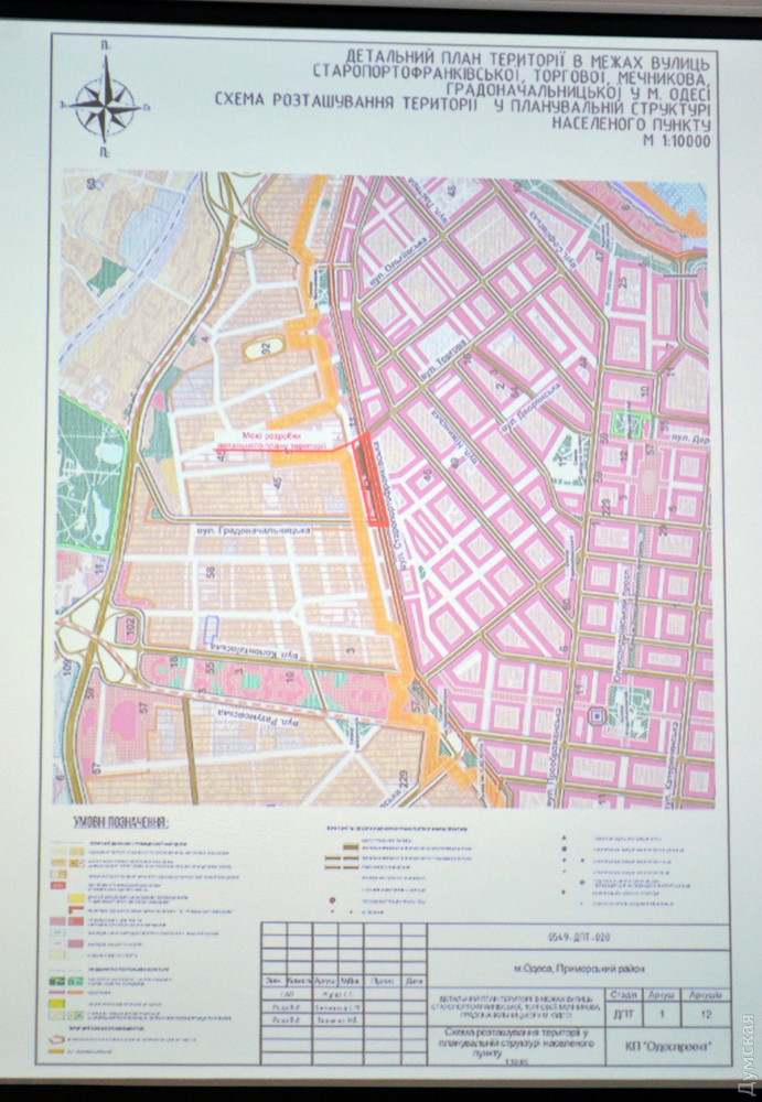 «Линия застройки не позволяет расширить улицы, поэтому их ширина останется в существующих границах: Старопортофранковская – 25,5 метров, Градоначальницкая – 27,5 м, Торговая – 21 м, Мечникова – 15 м»,- утверждает докладчица.