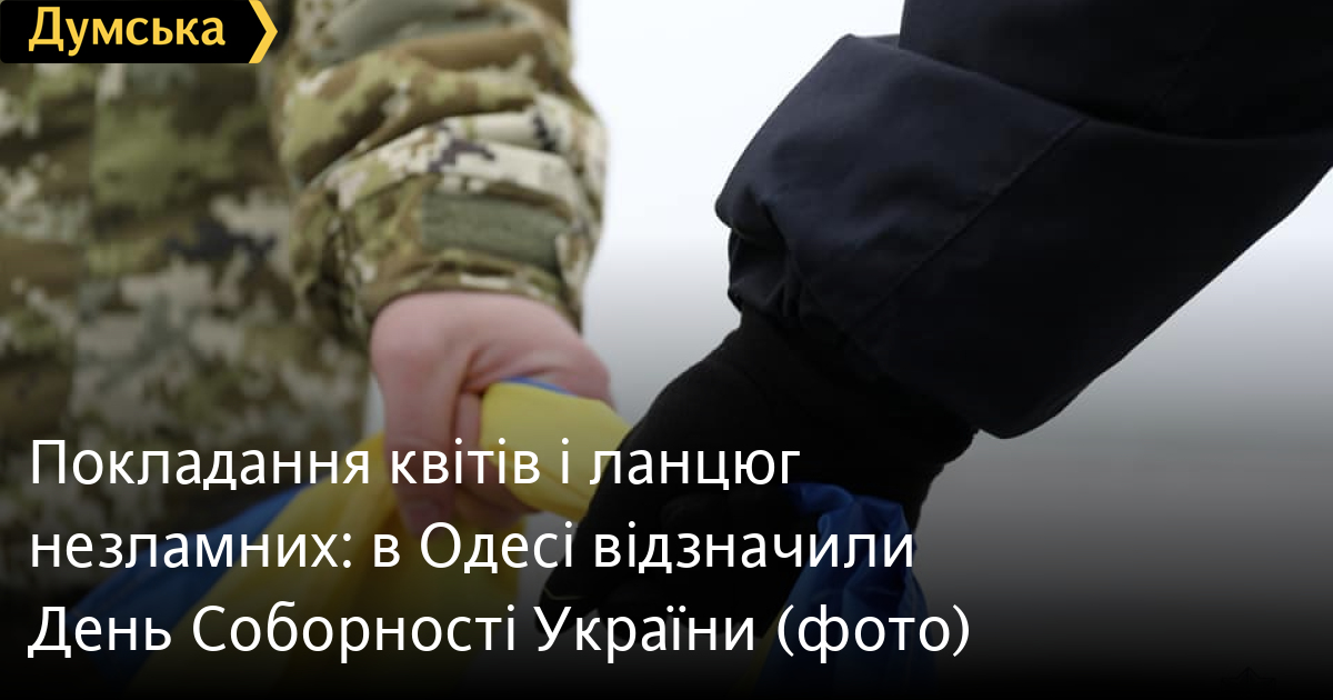 Покладання квітів і ланцюг незламних: в Одесі відзначили День Соборності УкраїниСтворенням ланцюга незламних і покладанням квітів до пам'ятника Тарасові Шевченку в однойменному парку відзначили в Одесі День Соборності України. У церемонії покладання взяли участь представники міської та обласної влади. Ланцюг незламних на одеському Ланжероні створили військовослужбовці та поліцейські. «Цього року ми стали ще сильнішими. Нас згуртувала війна. Військові, поліцейські, волонтери, лікарі, підприємці і просто небайдужі люди, кожен на своєму місці щоденною працею наближає перемогу України. А створений сьогодні ланцюг незламних — це символ нашої єдності та соборності!» — зазначили в патрульній поліції. СМЕРТЬ РОСІЙСЬКИМ ОКУПАНТАМ! Помітили помилку? Виділяйте слова з помилкою та натискайте control-enter |