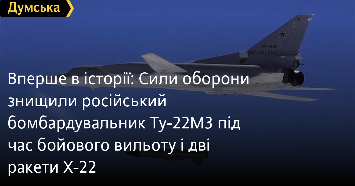 Як повідомили в командуванні Повітряних сил України, це сталося вперше, як і знищення двох крилатих ракет Х-22. Джерела повідомляють, що літак атакували за 300 км від України.