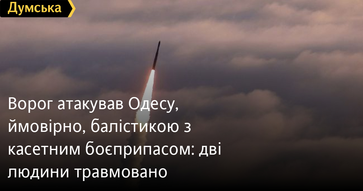 Ворог атакував Одесу, ймовірно, балістикою з касетним боєприпасом: дві людини травмованоБалістичною ракетою з касетним боєприпасом імовірно атакували Одесу ввечері 31 травня. Метою російських терористів стала припортова інфраструктура, повідомили в обласній військовій адміністрації. Осколкові поранення дістали двоє людей: 28-річна дівчина та 37-річний чоловік. Наразі вони госпіталізовані в стані середнього ступеня тяжкості. Їм надається вся необхідна медична допомога. СМЕРТЬ РОСІЙСЬКИМ ОКУПАНТАМ! Помітили помилку? Виділяйте слова з помилкою та натискайте control-enter |