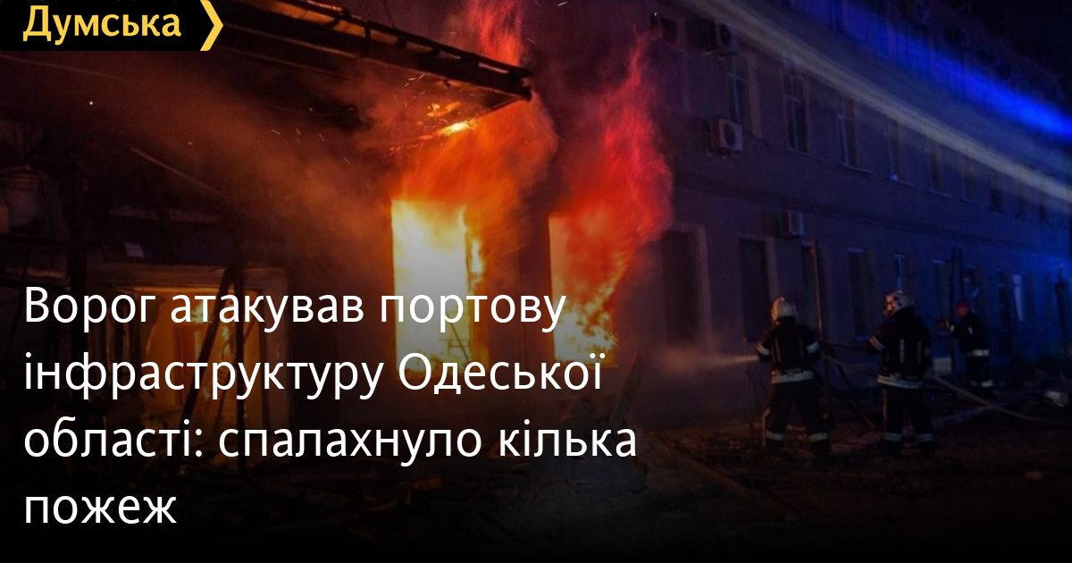 Ворог атакував портову інфраструктуру Одеської області: спалахнуло кілька пожежВорог атакував портову інфраструктуру ударними безпілотниками на Дунаї. У результаті удару спалахнули пожежі, які рятувальники оперативно загасили, повідомили в ДСНС. Пошкоджено складські приміщення та адміністративні будівлі. За попередніми даними, обійшлося без загиблих і постраждалих. Триває огляд пошкоджень та ліквідація наслідків. До ліквідації залучено 37 пожежників та 8 одиниць техніки. СМЕРТЬ РОСІЙСЬКИМ ОКУПАНТАМ! Помітили помилку? Виділяйте слова з помилкою та натискайте control-enter |