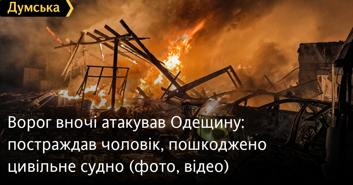 Ворог вночі атакував Одещину: постраждав чоловік, пошкоджено цивільне судно (фото, відео)Масованої атаки рф зазнав Ізмаїльський район минулої ночі. На щастя, обійшлося без жертв. Як повідомив голова Одеської ОВА Олег Кіпер, окупанти гатили по цивільній та портовій інфраструктурі. У результаті на території порту пошкоджено цивільне судно під прапором Панами, причал, баржу. Пошкоджень зазнало і портове обладнання. «Також зруйновано будівлю СТО з подальшим загорянням. Знищено два пасажирські автобуси, сім легкових автомобілів. Під удар потрапили і шість приватних будинків, у них пошкоджено покрівлі. Також пошкоджено автомобіль швидкої допомоги», — зазначив Кіпер. Обійшлося без загиблих і постраждалих. У ДСНС регіону додали, що загальна площа пожежі становила 700 кв.м, а роботу пожежників сильно ускладнювали повторні сигнали повітряної тривоги. До ліквідації наслідків залучали 20 осіб і п'ять одиниць техніки. ОНОВЛЕНО о 10:00. В прокуратурі повідомили, що внаслідок удару постраждав 51-річний чоловік. Його доставили до лікарні. СМЕРТЬ РОСІЙСЬКИМ ОКУПАНТАМ! Помітили помилку? Виділяйте слова з помилкою та натискайте control-enter