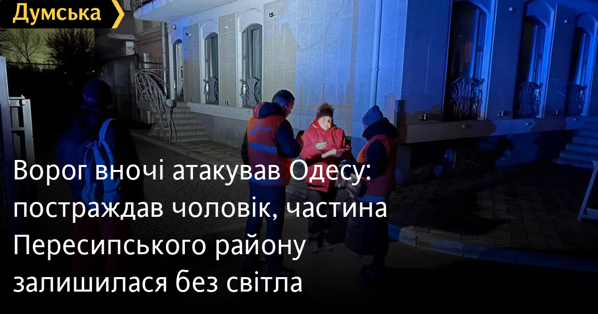 Ворог вночі атакував Одесу: постраждав чоловік, частина Пересипського району залишилася без світла30-річний чоловік постраждав в результаті двох ворожих атак по Одесі в ніч на 22 грудня. Його доставили до лікарні з осколковими пораненнями в стані середньої тяжкості, повідомив глава міської військової адміністрації Сергій Лисак. Крім того, пошкоджено об'єкт критичної інфраструктури міста, через що без світла залишилася частина одного з районів. «Пошкодження отримали вікна в житловому будинку. Комунальні служби працюють над ліквідацією наслідків, за що окремо дякую», — підкреслив Лисак. У пресслужбі ДТЕК Одеські електромережі додали, що через аварію частина Пересипського, Одеського та Білгород-Дністровського районів — без електроенергії. Фахівці вже працюють над відновленням. СМЕРТЬ РОСІЙСЬКИМ ОКУПАНТАМ! Помітили помилку? Виділяйте слова з помилкою та натискайте control-enter