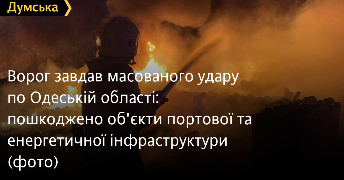 Ворог завдав масованого удару по Одеській області: пошкоджено об'єкти портової та енергетичної інфраструктуриЧергова дронова атака була здійснена на Одеську область в ніч на 4 листопада. Як повідомив глава ОВА Олег Кіпер, ворог завдав масованого удару по енергетичній та портовій інфраструктурі. Під ударом опинився Ізмаїльський район. «Незважаючи на активну роботу ППО, яка знищила більшість ворожих цілей, є влучання в об'єкти цивільної портової та енергетичної інфраструктури», — зазначив Кіпер. В результаті ударів виникли пожежі, пошкоджено виробничі споруди та обладнання. Рятувальники оперативно ліквідували загоряння. На щастя, загиблих і постраждалих немає. У пресслужбі ДТЕК Одеські електромережі заявили, що пошкодження їх об'єктів значні, і ремонтні роботи потребуватимуть тривалого часу. «Наші бригади приступлять до аварійно-відновлювальних робіт, як тільки отримають дозвіл від військових і рятувальників», — йдеться в повідомленні. У ДСНС регіону додали, що до ліквідації наслідків було залучено сім одиниць техніки та понад 30 рятувальників. СМЕРТЬ РОСІЙСЬКИМ ОКУПАНТАМ! Помітили помилку? Виділяйте слова з помилкою та натискайте control-enter