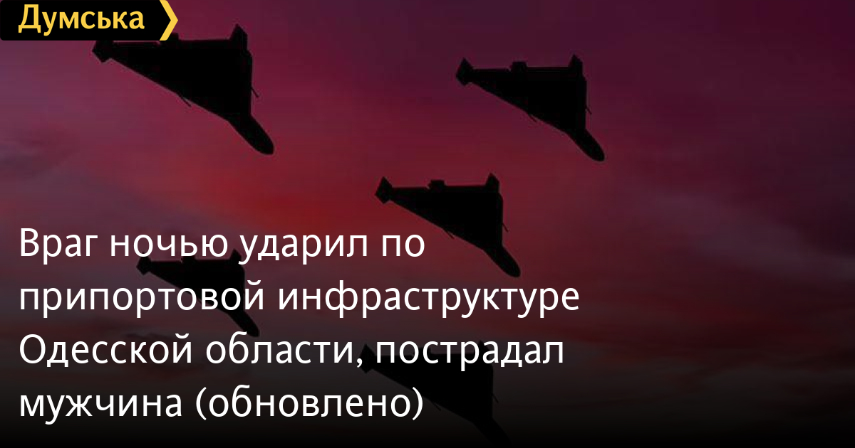 Ворог вночі завдав удару по припортовій інфраструктурі Одеської області, постраждав чоловік (оновлено)Ударними безпілотниками атакували окупанти Ізмаїльський район в ніч на 2 вересня. Як повідомили в пресслужбі місцевої адміністрації, удар припав на припортову інфраструктуру. «Завдяки своєчасному реагуванню на загрозу вдалося запобігти значним руйнуванням і людським жертвам», — підкреслили в РВА. Пожежі, що виникли в результаті ударів, оперативно ліквідували. ОНОВЛЕНО о 09:55. У пресслужбі прокуратури додали, що в результаті атаки постраждав 22-річний чоловік, якого госпіталізували. Крім того, пошкоджено майно декількох підприємств. СМЕРТЬ РОСІЙСЬКИМ ОКУПАНТАМ! Помітили помилку? Виділяйте слова з помилкою та натискайте control-enter Новини по цій темі: 1 січня: Нічний удар по Одещині: пошкоджено енергетичну інфраструктуру та житлові будинки (фото, відео) 31 грудня 2025: Новорічний наліт: Одеса під ударом російських шахедів 25 грудня 2025: Ворог вночі атакував Одеську область: одна людина загинула, двоє отримали поранення (фото) 23 грудня 2025: Ворог атакував південь Одещини: пошкоджено суховантаж, приватні будинки та енергооб'єкт (фото) 22 грудня 2025: Ворог вночі атакував Одесу: постраждав чоловік, частина Пересипського району залишилася без світла |