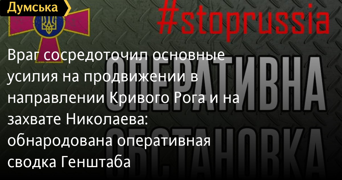 Как сообщают в Генштабе ВС Украины, с начала суток враг сосредоточил основные усилия на продвижении в направлении Кривого Рога и на захвате Николаева. Не оставляет попыток захватить Мариуполь.