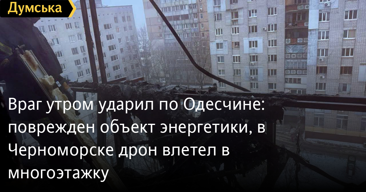 Враг утром ударил по Одесчине: поврежден объект энергетики, в Черноморске дрон влетел в многоэтажкуОчередной атаке врага подверглась гражданская и энергетическая инфраструктура Одесской области рано утром 20 января. Как сообщил глава ОВА Олег Кипер, оккупанты наносили удары по жилым кварталам и объектам энергетики. В Черноморске БПЛА попал в многоэтажный жилой дом. Повреждены фасад и остекление. Информация о пострадавших пока не поступала. «В Одесском районе также зафиксировано повреждение объекта энергетической инфраструктуры. По предварительной информации, пострадавших нет», — отметил он. На местах происшествий работают экстренные и коммунальные службы. СМЕРТЬ РОССИЙСКИМ ОККУПАНТАМ! Заметили ошибку? Выделяйте слова с ошибкой и нажимайте control-enter