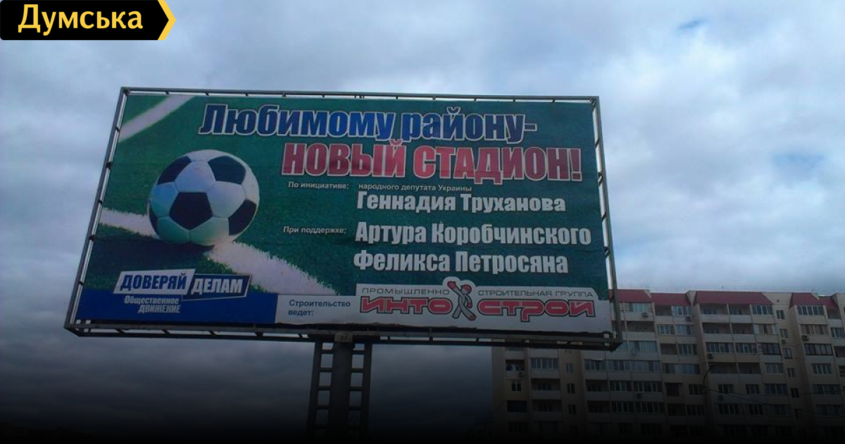 Время наследников: стадион в Суворовском районе будут строить Петросян и Коробчинский (фотофакт)Артур Коробчинский и Феликс Петросян-младший «помогут» нардепу Геннадию Труханову построить стадион на поселке Котовского. Об этом сообщают многочисленные билборды, появившиеся в Суворовском районе. Артур Коробчинский — владелец компании «Интострой», наследник предпринимателя и экс-кандидата в мэры Александра Коробчинского, убитого киллером в январе 2011-го года. Чемпион мира по тайскому боксу. Феликс Петросян-младший — сын бывшего зампреда областного совета, председателя Партии пенсионеров, скончавшегося от инсульта в мае 2010 года. Самый известный одесский «мажор». В ночь на 13 января 2008 года стал виновником резонансного ДТП на улице Академика Вильямса. Управляя внедорожником «Тойота Прадо» Феликс Феликсович врезался в «ДЭУ Ланос», а затем по цепочке, в другие автомобили. В аварии пострадало 11 автомобилей, а водитель «Ланоса» погиб. В результате экспертизы было доказано, что Петросян управлял автомобилем, находясь в состоянии алкогольного опьянения. Впоследствии дело закрыл суд. СМЕРТЬ РОСІЙСЬКИМ ОКУПАНТАМ! Помітили помилку? Виділяйте слова з помилкою та натискайте control-enter