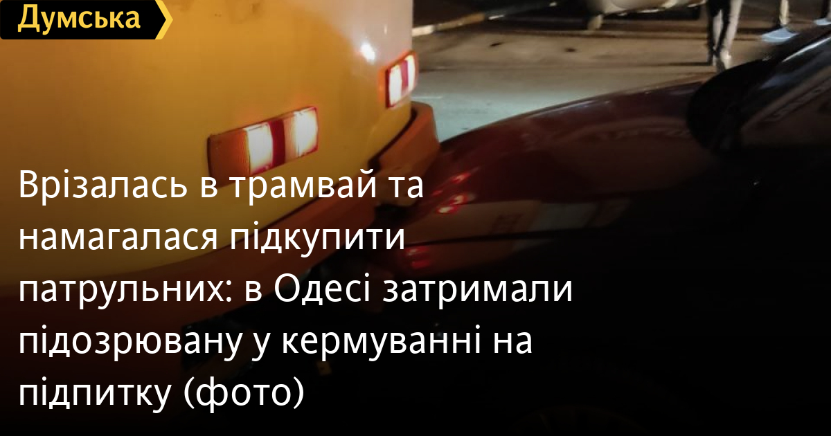 Врізалась в трамвай та намагалася підкупити патрульних: в Одесі затримали підозрювану у кермуванні на підпиткуВодійку, яка врізалась в трамвай, а потім намагалася підкупити копів, затримали в Одесі. Як повідомили в Патрульній поліції, жінка була п'яна. Автопригода сталася ввечері 25 грудня на Прохоровській вулиці. Водійка Volkswagen відмовилася від проходження освідування та просила патрульних «вирішити ситуацію між собою» за 100 доларів. Навіть кілька попереджень від поліцейських не зупинили її, тож інспектори викликали слідчих, аби ті задокументували порушення. СМЕРТЬ РОСІЙСЬКИМ ОКУПАНТАМ! Помітили помилку? Виділяйте слова з помилкою та натискайте control-enter Новини по цій темі: 25 жовтня 2025: Нова ера транспорту в Одесі: платимо будь-якою карткою і відстежуємо маршрутки онлайн 17 жовтня 2025: Хвилина мовчання: зупинити одеський транспорт змогли тільки копи, і то не скрізь - у мерії кажуть, що вивчають можливості (фото, відео) 30 серпня 2025: Машина вилетіла в кювет: мер Рені потрапив в аварію, його мати загинула, а маленький син у лікарні (фото) 18 серпня 2025: Троє загинули, один у лікарні: на трасі Одеса-Рені водій Mercedes не пропустив фуру (фото) |
