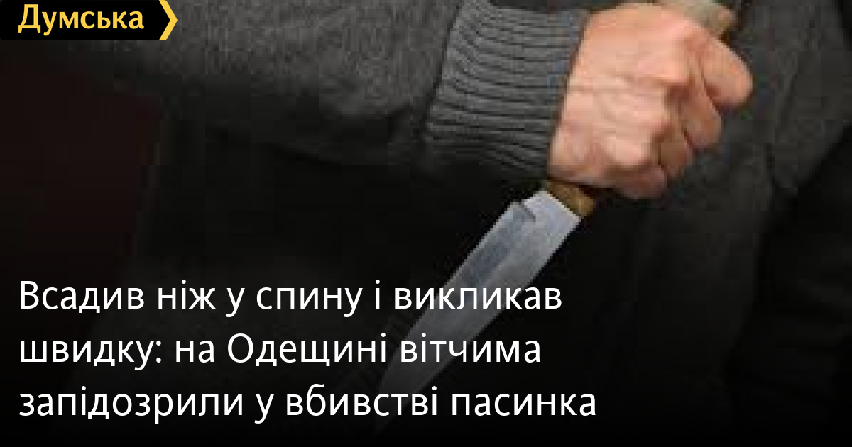 Всадив ніж у спину і викликав швидку: на Одещині вітчима запідозрили у вбивстві пасинкаТіло 25-річного чоловіка з ножовим пораненням спини знайшли в Кодимі Одеської області. Як повідомили «Думській» у поліції, це сталося ввечері 15 березня. Правоохоронців про те, що трапилося, сповістила швидка. Підозра впала на вітчима вбитого. За даними слідства, між чоловіками спалахнула сварка, під час якої старший схопив кухонний ніж і встромив його в спину пасинка. Потім, щоправда, викликав швидку, але було вже пізно. Підозрюваного затримали. СМЕРТЬ РОСІЙСЬКИМ ОКУПАНТАМ! Помітили помилку? Виділяйте слова з помилкою та натискайте control-enter |