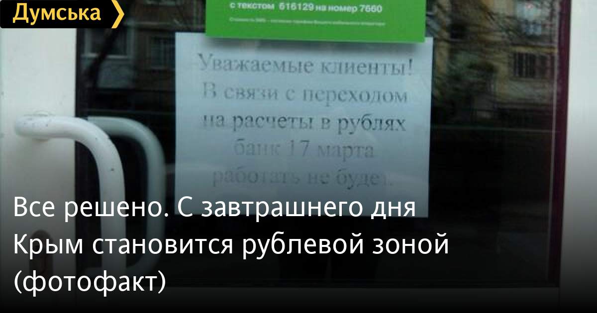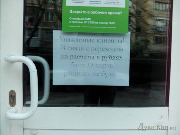 Еще одно доказательство, что «референдум» ничего не решает. Завтра крымские банки будут работать уже в рублевой зоне. Двери одного из отделений «Привата» на полуострове.