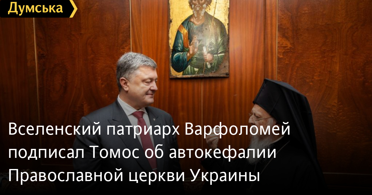 Только что на церемонии в Стамбуле Вселенский патриарх Варфоломей подписал Томос об автокефалии Православной церкви Украины.