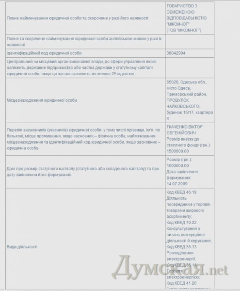 Учредителем «Миком-юг», если верить Единому госреестру организаций и предприятий Украины, является некий Виктор Ткаченко, он же – директор фирмы-застройщика санаториев «Славянский альянс», он же депутат облсовета, он же экс-член исполкома по квоте Маркова. Его супруга Анна Николаевна Ткаченко – соучредитель телеканала АТВ.
