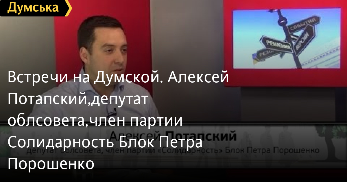 Встречи на Думской. Алексей Потапский,депутат облсовета,член партии «Солидарность» Блок Петра ПорошенкоВстречи на Думской. О дефолте говорили с Алексеем Потапским – депутатом облсовета, членом партии «Солидарность» Блок Петра Порошенко СМЕРТЬ РОССИЙСКИМ ОККУПАНТАМ! Заметили ошибку? Выделяйте слова с ошибкой и нажимайте control-enter Думская ТВ. Встречи на Думской: