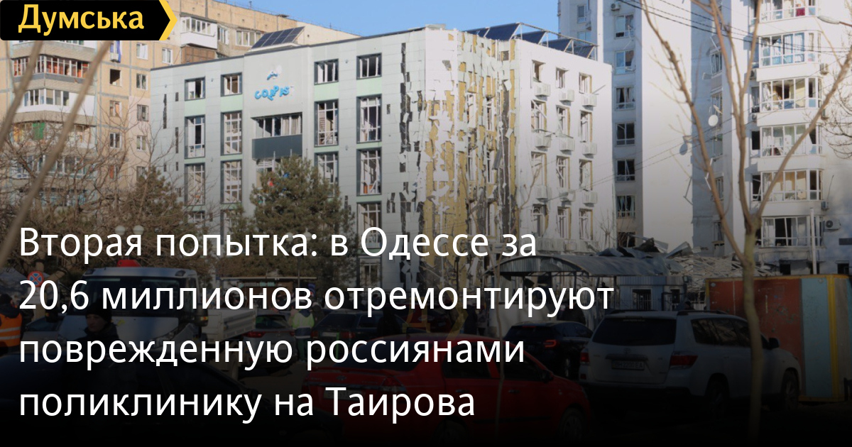Друга спроба: в Одесі за 20,6 мільйонів відремонтують пошкоджену росіянами поліклініку на ТаїроваКапітально відремонтувати постраждалу від ударів росіян будівлю Центру первинної медико-санітарної допомоги №4, що на проспекті Князя Ярослава Мудрого, 4 (раніше Глушка), планує одеська мерія. Відповідний тендер на суму 20 млн 654 тис. 900 гривень оголосили на порталі Prozorro, повідомляє кореспондент «Думської». Згідно з документацією, планується провести повну реконструкцію будівлі. Серед запланованих робіт: утеплення фасаду, заміна даху, вікон та дверей, оновлення внутрішніх приміщень, підлоги та стелі. Крім того, повністю замінять інженерні мережі та систему опалення, встановлять пожежну сигналізацію та облаштують пандуси для маломобільних груп населення. Ремонт має завершитися до 31 грудня 2026 року. Замовником робіт виступає управління капітального будівництва Одеської міської ради. Це друга спроба оголосити тендер на ремонт закладу. У квітні аналогічний тендер скасували через необхідність скоригувати проєкт. Після внесення змін сума робіт збільшилась на 4 млн 375 тис. 400 гривень. Нагадаємо, поліклініка залишилася майже без скла внаслідок атаки дронів 19 лютого. Тоді вибухи були такої сили, що з сусідніх будівель зірвало близько тисячі квадратних метрів фасаду. Усередині поліклініки не залишилося жодних дверей, що встояли на місці. СМЕРТЬ РОСІЙСЬКИМ ОКУПАНТАМ! Помітили помилку? Виділяйте слова з помилкою та натискайте control-enter |
