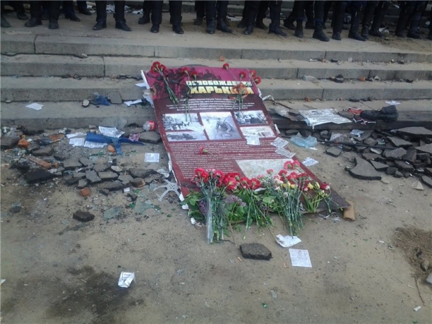 Здесь же присутствуют как минимум двести сотрудников милиции. Они по-прежнему окружают здание. Люди приносят на площадь цветы, воду и церковные свечи. Потасовок пока не было.