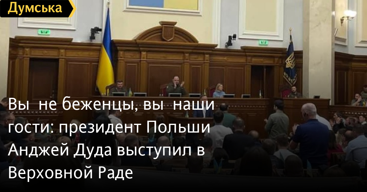 «Польский народ благодарит вас за ваше сопротивление, отвагу и защиту Родины. Вы – украинцы. Вы – не беженцы. Вы – наши гости. Мы сделаем все, чтобы Украина стала членом Европейского Союза», — заявил Дуда.
