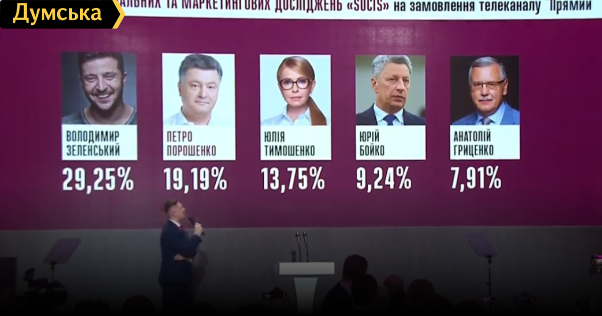 Так, согласно Национальному экзитполу, который проводят КМИС, «Демократические инициативы» и Центр Разумкова, тройка лидеров выглядит так: Владимир Зеленский — 30,4%, Петр Порошенко — 17,8%, Юлия Тимошенко — 14,2%. Экзитпол «Социса» дал ту же расстановку, но немного другие цифры: Зеленский 29,25%, Порошенко — 19,19%, Тимошенко — 13,75%, Бойко — 9,24%. Экзитпол 112-го канала: Зеленский — 30,7%, Порошенко — 18,6%, Тимошенко — 13,9%.