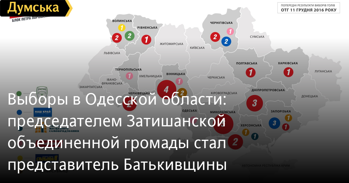 Выборы в Одесской области: председателем Затишанской объединенной громады стал представитель «Батькивщины»Вчера в 13 областях Украины прошли первые местные выборы в 41 объединенной тергромаде. В том числе выборы состоялись и в Одесской области – в Затишанском поселковом совете Захаровского (Фрунзовского) района. Как сообщают наблюдатели ГС ОПОРА, по предварительным данным, жители Затишанской объединенной территориальной громады избрали председателем действующего главу поссовета Геннадия Топольницкого («Батькивщина») Его поддержали 1225 избирателей, или 66,32%. Бывший глава Фрунзовской райадминистрации Павел Шестопалюк набрал 452 голоса, или 24,47%. Жители громады избрали и депутатов поселкового совета. Большинство получили представители «БПП« Солидарность». Напомним, накануне выборов председатель Захаровской районной администрации Дмитрий Франчук оказывал активную поддержку «Батькивщине» и был завсегдатаем в штабе партии. Похожая ситуация наблюдается в Ширяевском районе, в котором выборы назначены на 18 декабря: во время предвыборной кампании председатель райадминистрации Тарас Бойко открыто агитирует за своего кандидата и проводит контрагитацию против чужого. В том числе, для пиар-кампании чиновник использует газеты и сайт РГА. СМЕРТЬ РОСІЙСЬКИМ ОКУПАНТАМ! Помітили помилку? Виділяйте слова з помилкою та натискайте control-enter Новини по цій темі: 18 березня 2023: Експеримент: в Одеській області на селищному кладовищі вирішили безкоштовно надавати інвентар для догляду за могилами (фото) 29 липня 2021: В Одессу съехались мэры городов со всей Украины, чтобы обговорить реформу самоуправления (фото) 12 травня 2021: В рамках децентрализации три украинских города вырастут вширь |