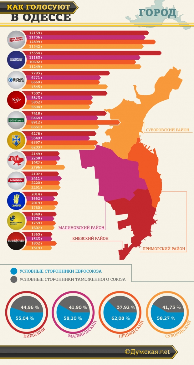 В целом Приморский оказался самым «проевропейским» из всех районов города. Сторонники сближения с Россией (КПУ, СУ и «Оппозиционный блок») суммарно набрали больше всего голосов в Киевском, где особенно успешными были коммунисты. А вот больше всего радикалов на душу населения оказалось в Суворовском районе — трудно сказать, по какой причине. Что касается Малиновского, то он - «крепкий середнячок»: итоговые результаты по этому району максимально близки к средн им по городу показателям.