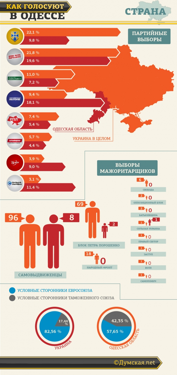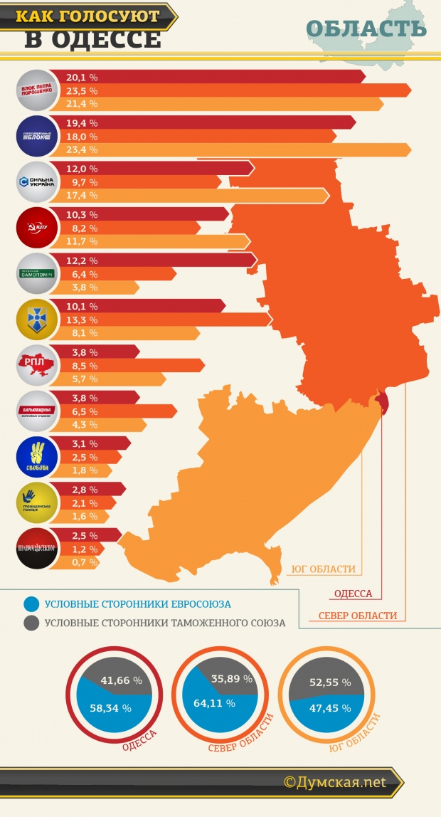 Если просуммировать голоса, полученные партиями, которые «за ЕС» и «за Россию», то выходит, что самым проевропейским является север области с соотношением 5:3. В Одессе также победили проевропейские партии с соотношением 5:4. А вот в Бессарабии больше голосов набрали сторонники сближения с Россией — они впереди с очень небольшим перевесом 10:9.
