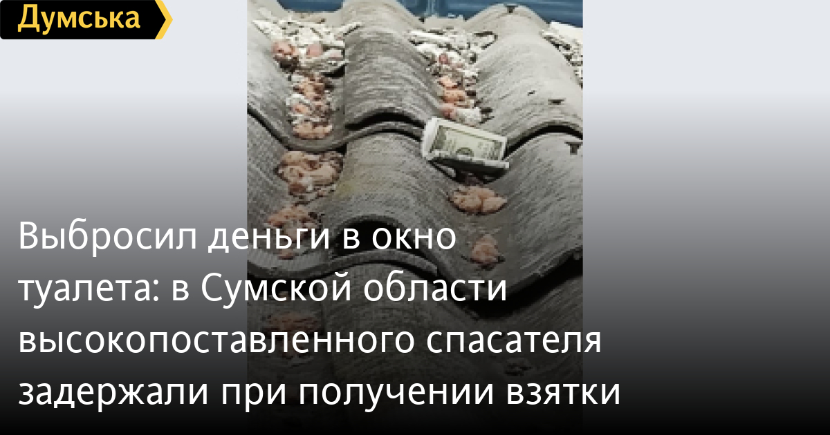 Выбросил деньги в окно туалета: в Сумской области высокопоставленного спасателя задержали при получении взяткиНачальник одного из горрайонных отделов ГСЧС в Сумской области задержан сотрудниками Государственного бюро расследований при получении взятки. Как сообщает пресс-служба ведомства, он вымогал тысячу долларов у местного бизнесмена за открытие магазина. «За эти деньги он обещал не создавать искусственные препятствия предпринимателю в его деятельности, а также не устраивать специальные проверки», — сообщают в ГБР. По данным бюро, 29 сентября предприниматель передал спасателю деньги в помещении ГСЧС. Когда чиновник понял, что передачу фиксируют правоохранители, он быстро выбежал в туалет, бросил деньги в окно и помыл руки, чтобы избавиться от следов. В ГБР заявляют, что нашли и изъяли всю сумму на крыше крыльца здания. Открыто уголовное производство по ч. 3 ст. 368 УК Украины (получение неправомерной выгоды служебным лицом).