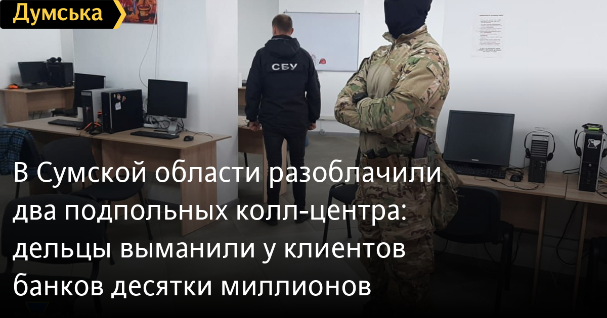 В Сумской области разоблачили два подпольных колл-центра: дельцы выманили у клиентов банков десятки миллионовДеятельность двух подпольных колл-центров прекратили сотрудники СБУ в Сумской области. Об этом сообщила пресс-служба ведомства. В их штате «работали» около 70 человек. По данным следствия, дельцы выманили у потерпевших десятки миллионов гривен. Они проворачивали незаконные схемы, купив базы данных банковских учреждений, от имени которых обзванивали клиентов. Мошенники входили в доверие к собеседникам, имитируя работу банковского служащего, который проводит телефонный опрос, предлагает новую банковскую услугу или кредит. Таким образом они выманивали у людей персональные данные, получали доступ к банковским счетам и снимали средства граждан. Часть денег организаторы передавали на финансирование группировки местного криминального авторитета Леры Сумского, который сбежал и скрывается за границей. Открыто уголовное дело, проводятся соответствующие процессуальные действия. СМЕРТЬ РОССИЙСКИМ ОККУПАНТАМ! Заметили ошибку? Выделяйте слова с ошибкой и нажимайте control-enter Новости по этой теме: 28 сентября 2021: Присвоил 12 миллионов и сбежал в ОРДЛО: СБУ задержала бывшего топ-чиновника оборонного сектора 25 сентября 2021: Обвиняют в подделке документов: СБУ объявила подозрение теще Шария 24 сентября 2021: Россия заканчивает подгонять образовательную отрасль "ДНР" под свои стандарты – СБУ 24 сентября 2021: Взрывчатка, тротиловые шашки и гранаты: на Львовщине у "общественника" обнаружили опасный тайник |