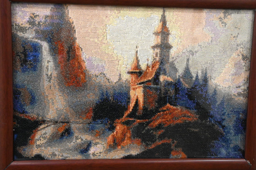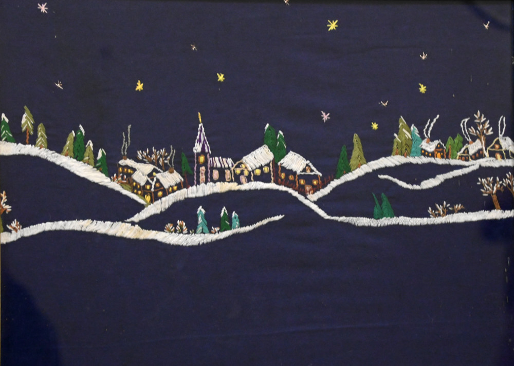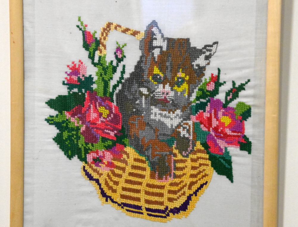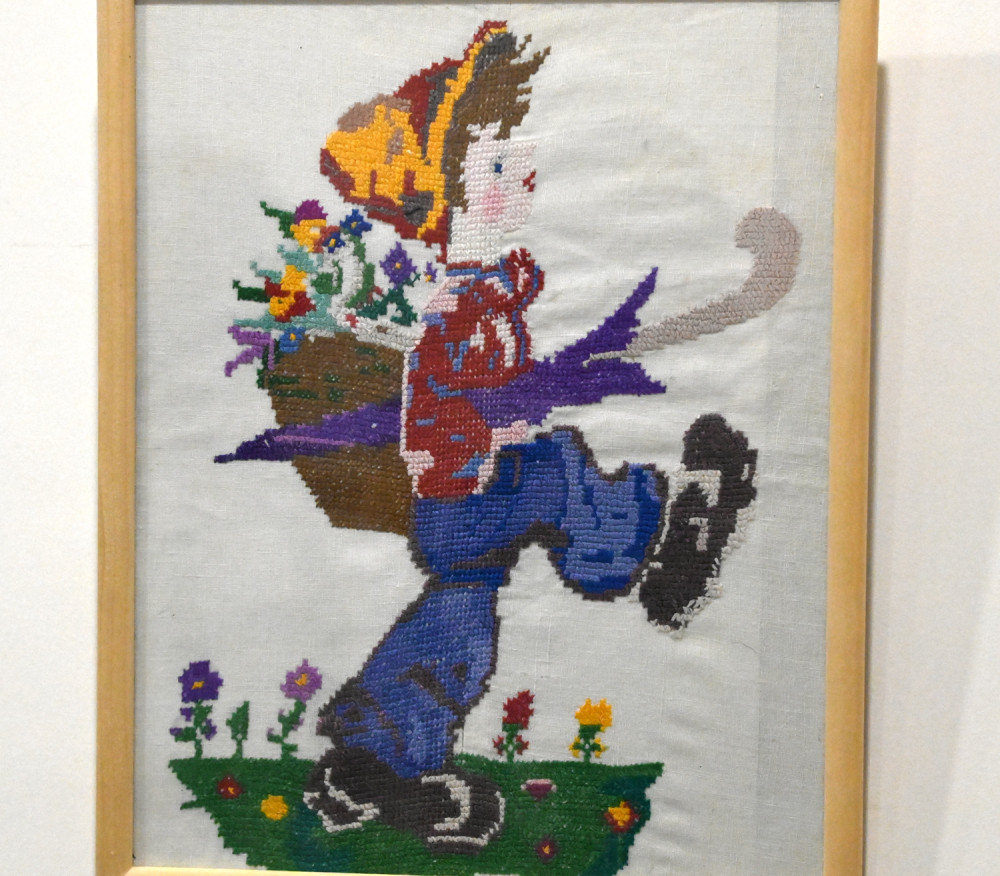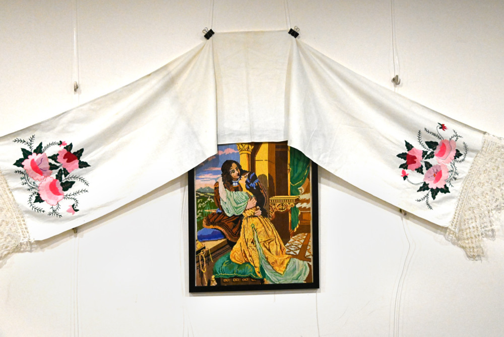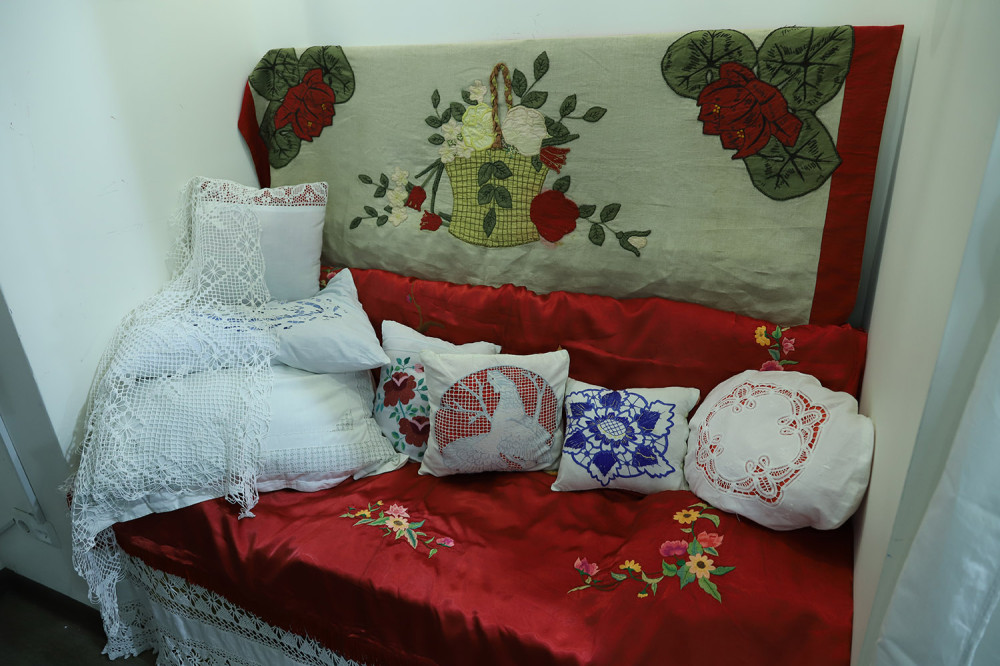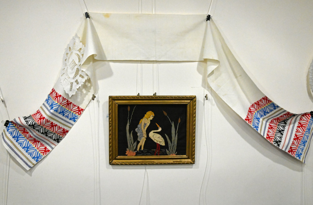 Здесь представлено творчество одесских женщин двадцатого века. Некоторым коврикам и картинам более сотни лет. Сюжет «Девушка и аист» был популярен в семьях этнических немцев, смущение девушки-купальщицы понятно, ведь, по древнему верованию, аисты улетали на зимовку не просто так, они превращались там в людей Пристальный взгляд птицы обескураживает белокурую красавицу. Другой сюжет, связанный с мистической птицей, у вышивальщиц практически не встречался. А в живописных полотнах немецких художников девицы часто наперебой подставляли подол в надежде, что аист уронит именно туда младенца, чья судьба будет, конечно же, благополучной и счастливой. Павлин на вышитых подушках и панно смутного беспокойства не вызывал, просто украшал интерьер и нес позитив.
