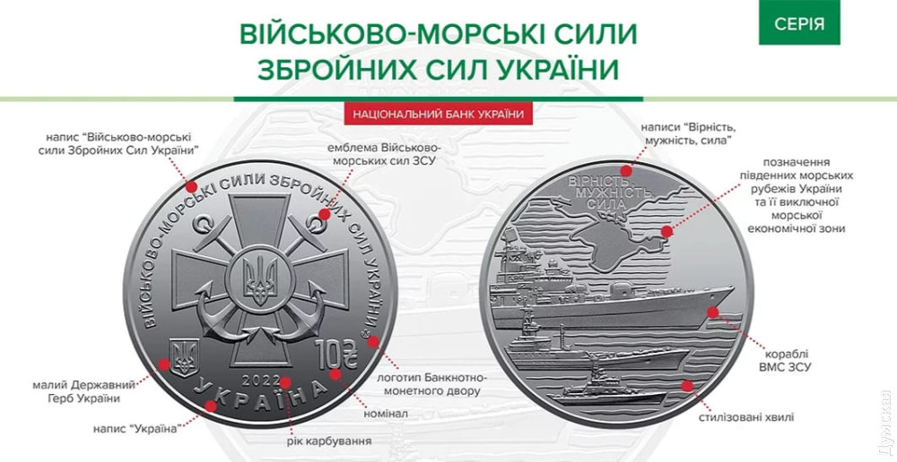 В описании монеты говорится, что она «посвящена отдельному виду Вооруженных Сил Украины, предназначенному для сдерживания или отпора во взаимодействии с другими видами Вооруженных Сил, другими военными формированиями и правоохранительными органами вооруженной агрессии против Украины с моря и на приморских направлениях, защиты суверенитета и государственных интересов Украины».