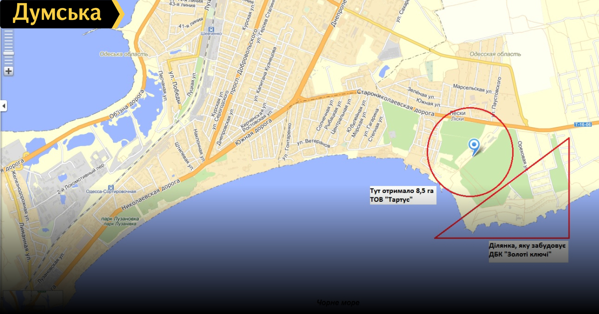 Госинспекция просила суд признать недействительным распоряжение Коминтерновской райадминистрации, на основе которого в ноябре 2009 года общество с ограниченной ответственностью «Тартус» получило в аренду на 49 лет участок площадью 8,5 га. Годом ранее хозсуд региона удовлетворил иск ООО и изменил статус этого участка с земель лесного фонда на земли рекреационного назначения, находящиеся в запасе. Лес в аренду передавать нельзя, а рекреационную территорию можно. Кроме того, также по решению суда, был согласован проект землеустройства для отвода фирме данного участка. Утверждать этот проект отказывалось Госуправление охраны окружающей природной среды в Одесской области, без заключения которого соответствующее решение не могла принять и Коминтерновская райадминистрация. Таким образом, 19 октября 2009 года Коминтерновская райадминистрация приняла распоряжение, которым утвердила проект отвода 8,5 га фирме «Тартус». На основании этого распоряжения 18 ноября 2009 года райадминистрация и ООО «Тартус» заключили договор аренды этого участка. Фирма получила землю, 8,2 га которой покрыта лесом, на 49 лет для размещения дачных домиков и автомобильных парковок. За изъятие земель лесного фонда ООО «Тартус» заплатило лесному хозяйству 469 тыс. грн. Отметим, что полученный ООО «Тартус» участок находится рядом с дачно-строительным кооперативом «Золотые ключи», рассчитанным на VIP-жителей. Недавно суд узаконил передачу этому кооперативу 16 га леса на побережье моря. Между тем участки из закрытого элитного кооператива «Тартус» тоже можно найти среди выставленных на продажу по цене около 20 тыс. дол. за сотку. Собственниками «Тартуса» являются Владимир Смирнов и Елена Поплинская.