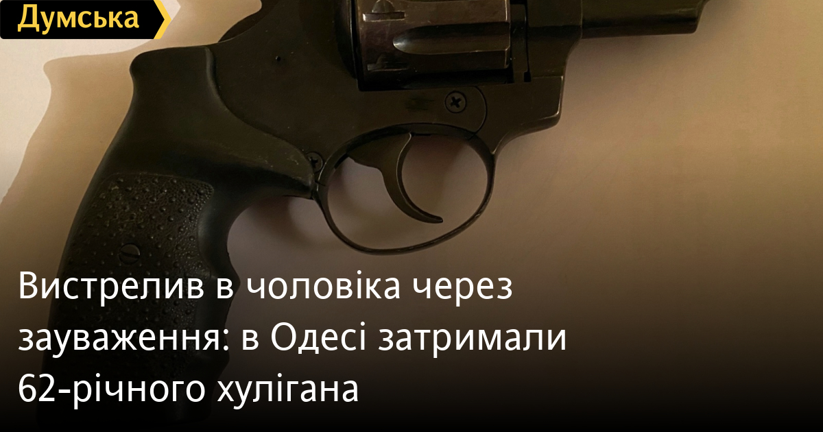 Вистрелив в чоловіка через зауваження: в Одесі затримали 62-річного хулігана62-річного одесита, який вистрелив у чоловіка за те, що він зробив йому зауваження, затримали правоохоронці. Як повідомили у пресслужбі поліції Одеської області, нетверезий правопорушник прискіпався до 51-річного чоловіка і образив його нецензурною лайкою, а, почувши у відповідь зауваження, вистрілив у нього з револьвера під патрон Флобера SAFARI. Подія сталася ввечері 24 січня у дворі на вулиці Академіка Корольова. Потерпілий отримав поранення стегна. Поліцію та швидку викликали очевидці. Правоохоронці затримали зловмисника, а медики доправили постраждалого в лікарню. Зброю поліцейські вилучили та направили на експертизу, а правопорушнику повідомили про підозру за ч. 4 ст. 296 Кримінального кодексу України. Цей злочин карається позбавленням волі на строк від трьох до семи років. Підозрюваний наразі перебуває в ізоляторі тимчасового тримання, слідчі клопочуть про обрання йому запобіжного заходу. Помітили помилку? Виділяйте слова з помилкою та натискайте control-enter Новини по цій темі: 29 липня 2025: В Усатово Одеської області сталася перестрілка: поліція працює на місці (відео, оновлено) 28 липня 2025: П'яний на "Ягуарі" або гіпертонік? Звільнений топ-посадовець одеської поліції хоче повернутися на службу 19 червня 2025: Дівчинку, яку шукали сотні одеситів, знайшли вбитою: поліція працює з чоловіком, ймовірно причетним до загибелі 27 травня 2025: Увели гектар в університету: на Одещині засудили земельних аферистів, але без посадки і Хвоста |