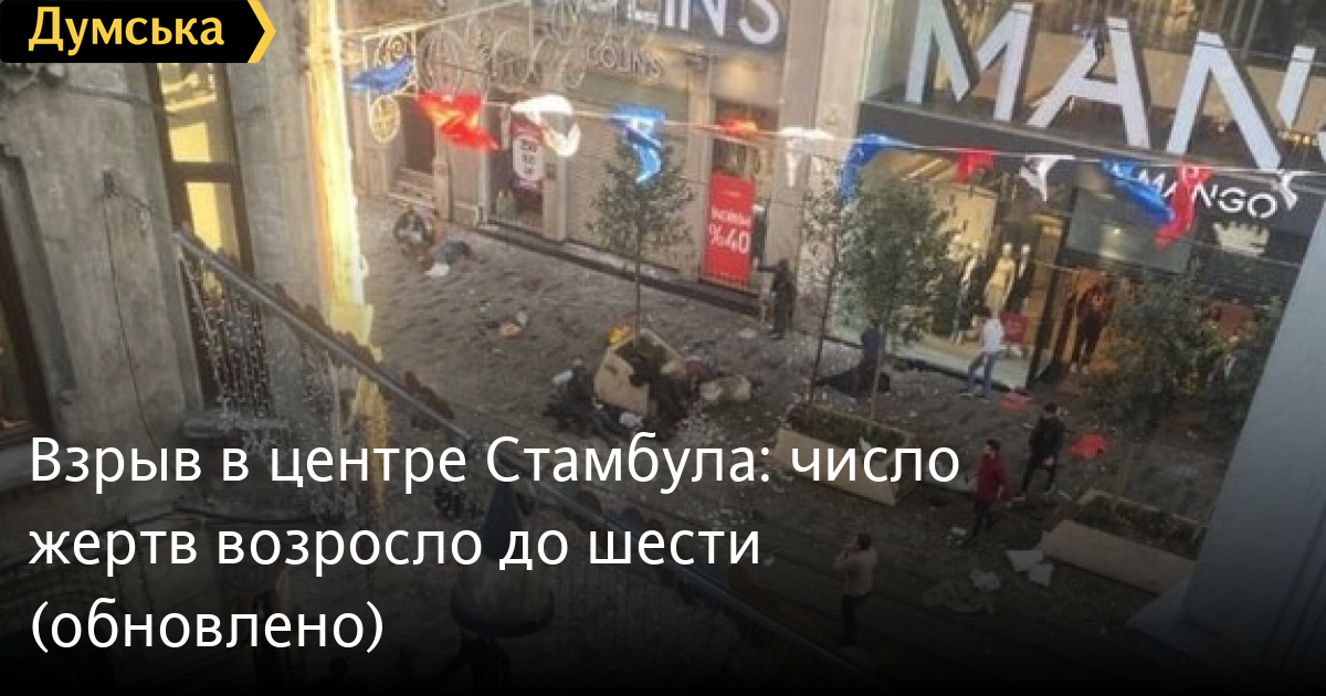 Вибух у центрі Стамбула: кількість жертв зросла до шести (оновлено)Кількість загиблих унаслідок сьогоднішнього вибуху в центрі Стамбула зросла до шести, поранених — до 53. Про це повідомив на прес-конференції президент Туреччини Реджеп Ердоган, повідомляє державне турецьке агентство Anadolu. «Наша нація має бути впевнена, що винуватці інциденту на вулиці Істікляль будуть покарані, як вони заслуговують. Відповідні підрозділи нашої держави продовжують свої зусилля з розкриття виконавців цього підступного нападу та асоціацій, що стоять за ним», — зазначив він. ОНОВЛЕНО О 21:39. Кількість постраждалих досягла 81. Як повідомив віцепрезидент Туреччини Фуат Октай, вибух влаштувала смертниця, передає ВВС. СМЕРТЬ РОСІЙСЬКИМ ОКУПАНТАМ! Помітили помилку? Виділяйте слова з помилкою та натискайте control-enter |