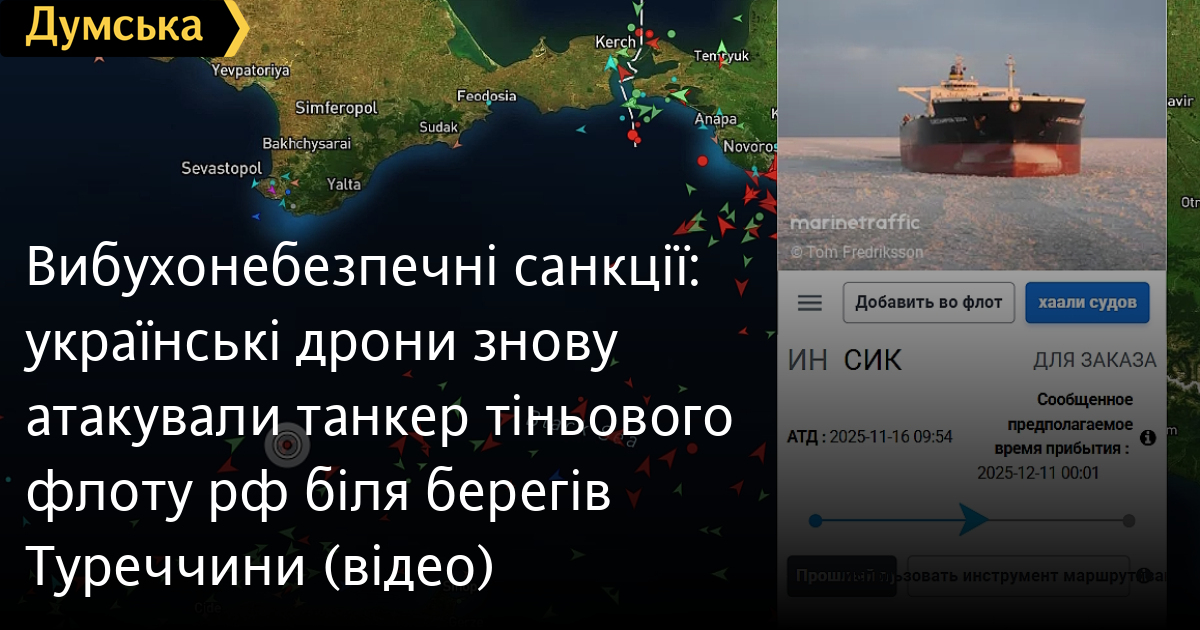Вибухонебезпечні санкції: українські дрони знову атакували танкер тіньового флоту рф біля берегів Туреччини (відео)Танкер тіньового флоту рф DASHAN (IMO 9299666) під прапором Гамбії був уражений українськими морськими дронами. Як повідомили «Думській» джерела у ВМС України, судно було атаковане сьогодні вранці в Чорному морі, приблизно за 150 км від північного узбережжя Туреччини. Позначка ідентифікаційної системи (АІС) зникла понад 10 годин тому. Танкер йшов порожнім до Новоросійська за російською нафтою. Судно побудоване у 2005 році, довжина 274 метри, ширина 50 метрів, дедвейт 164 600 тонн. Судячи з усього, танкер атакували морські дрони типу Sea Baby — їх модернізований варіант з недавніх пір здатний вражати будь-яку ціль в Чорному морі. В кінці листопада такі ударні системи вразили танкери Kairos і Virat, які теж належать до тіньового флоту рф. «Якісь коментарі тут зайві, — каже військовий оглядач «Думської» Віктор Босняк. — Це класична »заборона моря«. Вони хотіли влаштувати морську блокаду нам, але в підсумку отримали таку ж ситуацію для себе. Україна заборонила їм Чорне море!» СМЕРТЬ РОСІЙСЬКИМ ОКУПАНТАМ! Помітили помилку? Виділяйте слова з помилкою та натискайте control-enter Новини по цій темі: 1 січня: Нічний удар по Одещині: пошкоджено енергетичну інфраструктуру та житлові будинки (фото, відео) 31 грудня 2025: Новорічний наліт: Одеса під ударом російських шахедів 25 грудня 2025: Ворог вночі атакував Одеську область: одна людина загинула, двоє отримали поранення (фото) 23 грудня 2025: Ворог атакував південь Одещини: пошкоджено суховантаж, приватні будинки та енергооб'єкт (фото) 22 грудня 2025: Ворог вночі атакував Одесу: постраждав чоловік, частина Пересипського району залишилася без світла |
