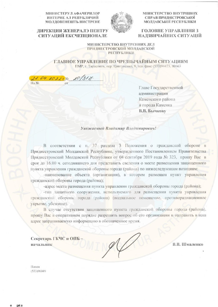 Как сообщает пресс-служба Главного управления разведки Министерства обороны Украины, 22 апреля секретарь «Госкомиссии по ликвидации чрезвычайных ситуаций» «ПМР» Вадим Шмаленко обратился с письмом к председателю Каменского района Владимиру Бычкову. В нем говорилось о срочной (до 16:00 того же дня) подготовке сведений о наличии и местоположении «защищенного пункта управления гражданской обороны города».