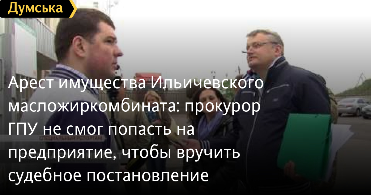 Арест имущества Ильичевского масложиркомбината: прокурор ГПУ не смог попасть на предприятие, чтобы вручить судебное постановлениеПрокурор Генпрокуратуры Петр Фицай попытался вручить представителям Ильичевского Масложиркомбината решение Печерского суда от 28 апреля. Анатолий Худяков, который представился представителем руководства предприятия и заявил, что имеет полномочия «на все», пустить представителя Генпрокуратуры на территорию предприятия отказался, поэтому постановление суда пришлось зачитывать прямо на улице возле проходной. Согласно ему, имущество Масложиркомбината арестовано и должно быть передано на хранение предприятию «Облшелк». «Постановление об аресте вступает в силу немедленно. Оно может быть обжаловано в апелляционном суде в Киеве в течение трех дней с момента получения ее копии», — отметил Петр Фицай. После ознакомления с постановлением Анатолий Худяков значительно сократил свои полномочия, сказав, что является лишь адвокатом. Подписывать постановление суда отказывается. Зато обещает вызвать должностное лицо, которое уполномочено это сделать. Спустя некоторое время Худяков заявляет, что не может дозвониться до человека, который уполномочен поставить свою подпись. Арест на имущество наложен в рамках расследуемого генпрокуратурой уголовного производства. Как утверждают столичные юристы, должностные лица прогоревшего «Дельта-Банка» действовали по стандартному сценарию: растащить и перераспределить. С помощью финансовых махинаций были выведены из-под залога активы, подчеркивает представитель юридической компании Роман Шахматенко. Ущерб, нанесенный государству, составил свыше 646 миллионов гривен. Ни руководитель, ни должностные лица на комбинат так и не явились. Вместо них у проходной начали собираться молодые люди спортивного телосложения. Вскоре их собралось порядка ста человек. «Эти действия руководства завода, направленные на блокирования исполнения судебного решения, неизвестно, какие у них отношения, но люди в спортивном блокируют проход на территорию завода», — отметил адвокат Дмитрий Кизенко. «Я считаю, что это полный криминал. И все эти люди вокруг тоже, никто иные, как криминал. Они не допускают произвести законные действия ни Генпрокуратуре, ни законному предприятию, госпредприятию», — говорит руководитель предприятия «Облшелк» Олег Федоров. Несмотря на напряженную ситуацию, директор и юристы «Облшелка» не оставляют попыток найти «главного» на предприятии. Но эти попытки не увенчались успехом. Выполнить определение суда следователю генеральной прокуратуры так и не удалось. По словам юристов — это уголовное преступление, за которое грозит от трех до пяти лет лишения свободы. СМЕРТЬ РОСІЙСЬКИМ ОКУПАНТАМ! Помітили помилку? Виділяйте слова з помилкою та натискайте control-enter Думская ТВ. Сюжеты: