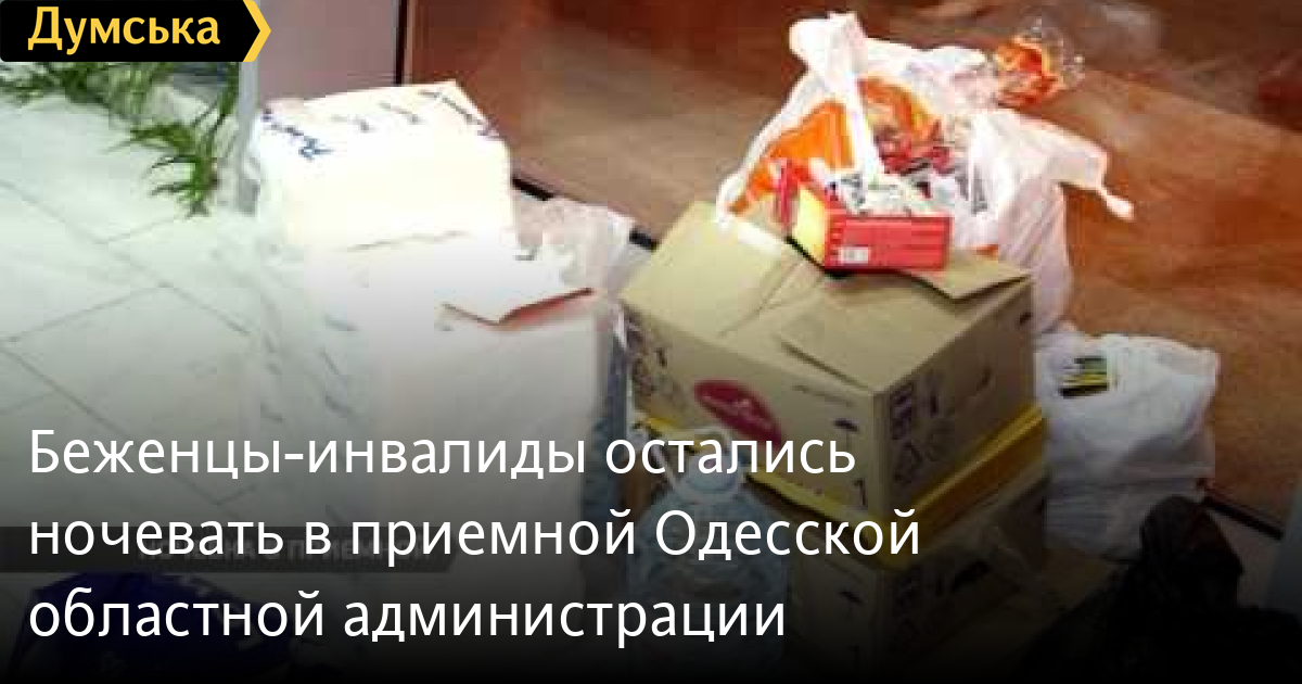Беженцы-инвалиды остались ночевать в приемной Одесской областной администрации. Люди требуют восстановить подачу электроэнергии в санатории «Куяльник». Более 450 человек, многие из которых — лежачие больные, вынуждены жить без света и воды уже более суток. Подробности — в сюжете «ДумскойТВ». СМЕРТЬ РОССИЙСКИМ ОККУПАНТАМ! Заметили ошибку? Выделяйте слова с ошибкой и нажимайте control-enter Думская ТВ. Сюжеты: