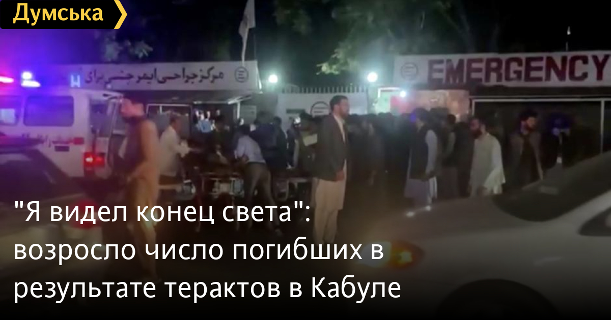 По меньшей мере 85 человек погибли в результате двух взрывов возле аэропорта Кабула в Афганистане. Об этом сообщает Aljazeera со ссылкой на официального представителя движения «Талибан» в афганской столице, а также источник в местной больнице. По данным телеканала, среди жертв теракта — 13 американских солдат. Также сообщается о 158 пострадавших от взрывов людей, получивших ранения различной степени тяжести. Напомним, первый взрыв произошел вчера в толпе афганцев, которые пытались попасть на территорию аэропорта. Второй осуществили при помощи заминированного автомобиля. Представителю Reuters удалось пообщаться с одним из выживших после теракта. «Как будто кто-то вырывал землю из-под моих ног; на мгновение мне показалось, что у меня разорваны барабанные перепонки, и я потерял слух, — сказал мужчина, пожелавший не разглашать своего имени. — Я видел тела, части тел, пожилых и раненых мужчин, женщин и детей, разбросанных на месте взрыва. Невозможно увидеть конец света в этой жизни, но сегодня я видел конец света, я был свидетелем его собственными глазами». Ранее сообщалось, что ответственность за атаку на аэропорт Кабула взяла террористическая организация «Исламское государство». Причастность ИГИЛ к атаке подтвердили в военных ведомствах США и Великобритании. СМЕРТЬ РОСІЙСЬКИМ ОКУПАНТАМ! Помітили помилку? Виділяйте слова з помилкою та натискайте control-enter |