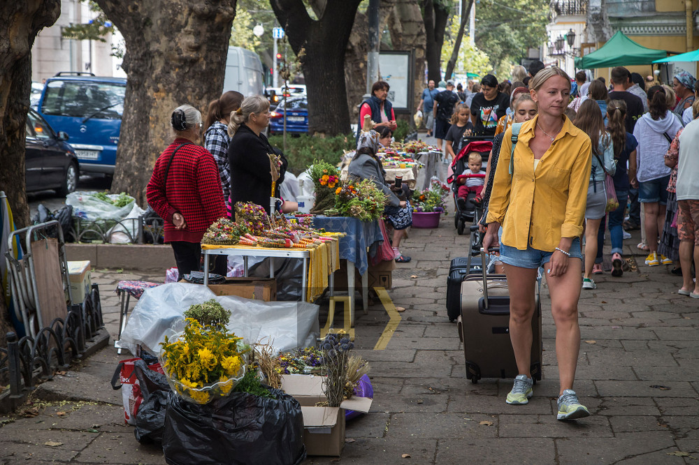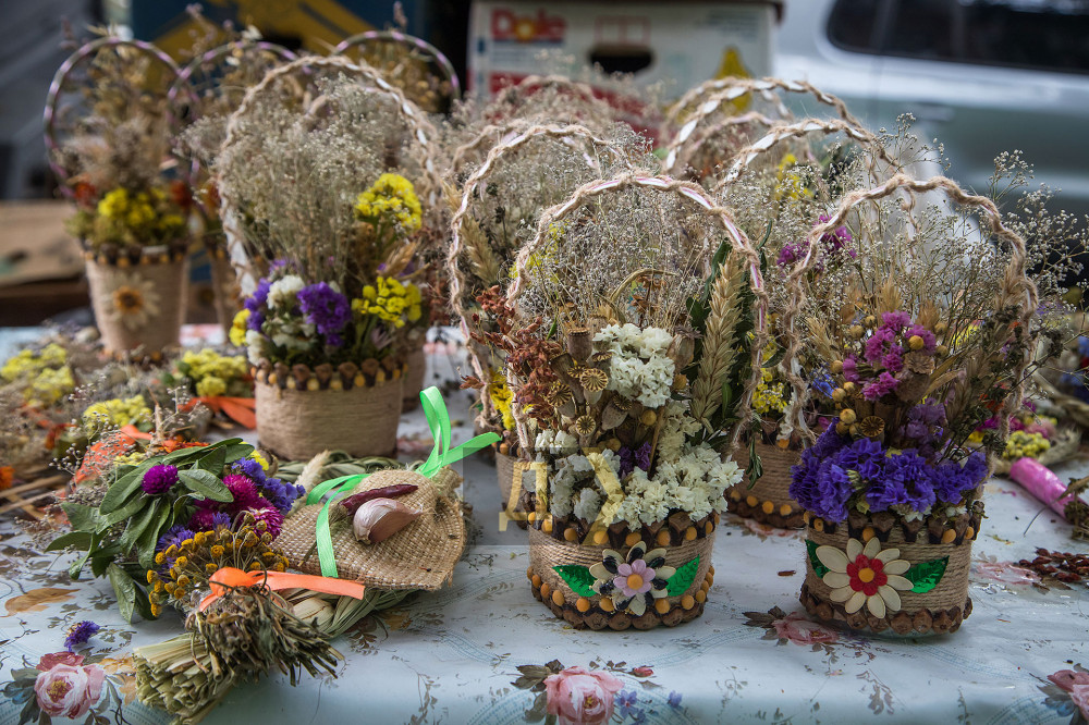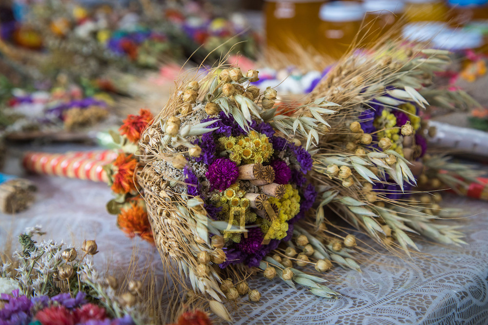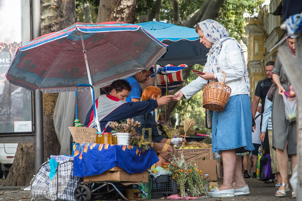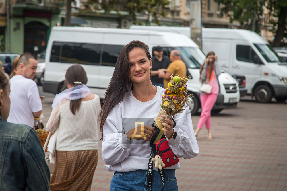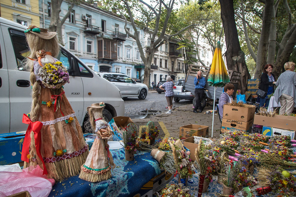 Самый маленький букетик из полевых цветов, пшеничных колосьев и головок мака можно купить за 15 гривен. Огромную мотанку из пшеничных колосьев и ткани — за 300 гривен. Также возле храмов можно приобрести главные продукты праздника — яблоки и мед.